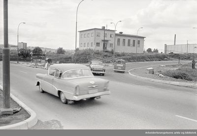 Fra krysset Lørenveien og Ringveien. Forsamlingslokalet og kinoen Lørenhallen, Lørenveien 63 i bakgrunnen.
