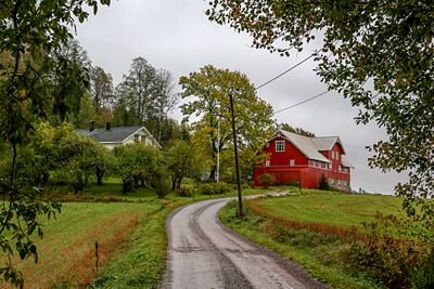 Løvstadveien med Vestre Løvstad gård i bakgrunnen.