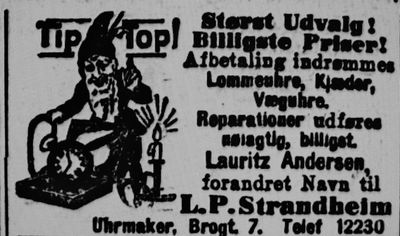 | En i håndverkerkretse kjent og aktet mann urmaker L. P. Strandheim er avgått ved døden, 69 år gammel. … Urmaker Strandheim var meget interessert i sitt fag. Han var en tid medlem av styret i Oslo krets av Norges Urmakerforbund, og i en årrekke møtte han i forbundet som delegert fra hovedstaden. Budskapet om hans døde vil vekke sorg blant kolleger og hans mange bekjente. | ||
