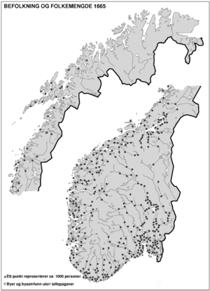Befolkningsutvikling. Den grunnleggende beskrivelsen av befolkningsutviklingen skjer ved å kartlegge forandringer i folketallet. Før den første egentlige folketelling (se dette) ble avholdt i Norge i 1769, må man beregne folkemengden på indirekte måter. I middelalderen er det vanlig å bruke bosetningen, uttrykt i antallet gårder og bruk. Man forutsetter da for eksempel at det fantes ett hushold (se dette) per bruk, og at gjennomsnittshusholdet var på 6 personer. Med en slik metode har Jørn Sandnes anslått landets folkemengde etter dagens grenser til vel 300 000 i høymiddelalderen. Beregninger som har trukket inn andre typer av data, går høyere og like opp i 500 000. Blant annet bosetningskontraksjon og fall i jordleien kan antyde at Svartedauden i det første pestangrepet i 1349 og i de følgende tiårene reduserte folketallet til et sted mellom 30 og 50 prosent av høymiddelalderens maksimum.