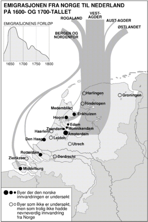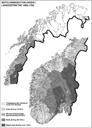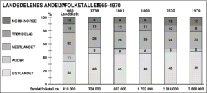 Den geografiske fordelingen av befolkningen framviser to faser med større forskyvinger landsdelene imellom. I perioden 1650–1750 hadde Østlandet vekst mens resten av Norge var preget av stagnasjon. I løpet av dette hundreåret økte derfor Østlandet sin andel av befolkningen. Gjennom det meste av 1800-tallet opplevde Nord-Norge klar netto tilflytting både fra Sør-Norge og de nordlige strøkene av Finland og Sverige. I Sør-Norge skjedde det samtidig netto fraflytting fra de indre strøkene både mot kysten og til Amerika.