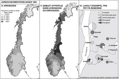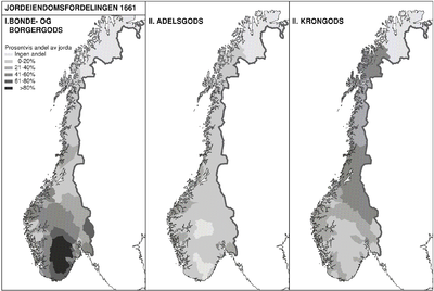 I 1661 er ca. 31 % av jorda regnet som krongods, og 21% som kirkelig gods (alt kapitelsgodset medregnet). Adelsgodset var på ca. 8 %, og det privateide godset ellers ca. 40 %. Omtrent halvparten av dette var bondeselveie, dvs. jordeiendom som eierne selv brukte. Av den andre halvdelen var det meste bondegods, slikt som bondeeiere leide bort til andre. Borgere og embetsmenn hadde foreløpig lite jordeiendom, kanskje rundt 5% av det hele.