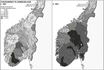 Adelsgodset og leilendingsgodset til bøndene smuldret bort i løpet av noen tiår deretter; det gikk i smått over til andre private eiere. I 1660- og 70-årene ble mye off. gods avhendet i store partier. Krongodssalgene omfattet størstedelen av krongodset og det verdslige forleningsgodset. Borgere og borgerlige embetsmenn kjøpte det meste, men de begynte ganske snart å selge videre til leilendingene, og satte dermed fart i den prosessen som kalles overgangen til selveie. Den begynte først på Østlandet, noe etter 1700 i Trøndelag og i de indre Vestlandsbygdene, og fikk tilvekst ved at mer krongods og det meste av skole- og hospitalsgodset gjennom 1700-årene og rundt 1800 ble solgt direkte til brukerne. Omkring 1820 var det på landsbasis omtrent 65 % bondeselveie, 20 % tilhørte private godseiere, proprietærer, og 15 % var offentlig gods. Av det siste var det bare ubetydelige rester igjen omkring 1900, mest som embetsgårder, etter at prestebordsgodset var solgt til selveie. Proprietærgodset holdt seg lengst i Nord-Norge, her og der på Vestlandet (Rosendal), i det tidligere grevskapet Larvik og ved en del sagbruk, jernverk o.l. på Østlandet og i Trøndelag. Men også dette var på det nærmeste avviklet ved siste århundreskifte. Se kart s. 180-182. Jf. kirkegods, prestebordsgods. K.J.