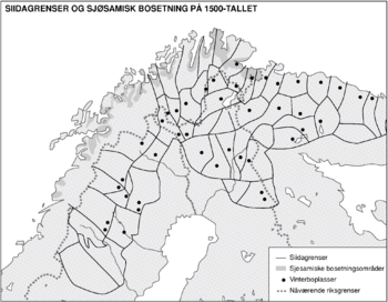 IV. Næringstilpasning, samfunnsform og terminologi. I middelalderen og tidlig nytid framtrer samene i første rekke som et utpreget veidefolk, basert på jakt, fangst og fiske, ved siden av sanking av andre ressurser som dun, egg og bær. Villreinfangst – ved hjelp av fangstgroper og ledegjerder i terrenget – og jakt på pelsdyr var hovedelementer i økonomien. Samtidig opprettholdt samene livlige handels- og bytteforbindelser utad: Dels sto de i kontakt med andre finsk-ugriske grupper i øst; og dels ga samenes omfattende produksjon av kostbart og ettertraktet pelsverk grunnlag for tilknytning til vidstrakte handelssystemer i øst, sør og nord – gjennom kontakt med russere, kareler, finner, svensker og nordmenn. Over størstedelen av det samiske bosettingsområdet var de enkelte hushold organisert i lokalsamfunn (på samisk kalt siida, hvor kollektive samfunnsinstitusjoner sto sterkt. Ressursområdene – som i stor grad var organisert rundt vassdrag i innlandet eller fjordlandskap langs kysten – ble regnet for å tilhøre siidaen i fellesskap. Ved overgangen mellom 1500- og 1600-tallet synes denne samfunnsformen å ha dominert hele det indre av Nordkalotten, inkludert indre Finnmark, samt de østligste finnmarksfjordene og Kolahalvøya (se kart).