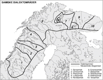 III. Språklig og kulturell variasjon. Språklig og til dels kulturelt faller den samiske befolkningen i historisk tid i en rekke undergrupper, som best kan illustreres med de ulike dialektområdene (se kart). I tillegg til dialektforskjellene atskiller disse samiske regionene seg også i en viss grad med hensyn til ytre, materielle kulturtrekk, som draktskikk (kofte), bygningstradisjoner med videre. Med henvisning til eldre administrativ og regional inndeling skiller en historisk mellom følgende dialekter: sørsamisk, umesamisk, pitesamisk, lulesamisk, nordsamisk, enaresamisk, østsamisk, áhkkilsamisk, kildinsamisk og tersamisk, se kart over dialektområder. (På norsk side regnes i dag umesamisk og pitesamisk for å være utdødd, mens sørsamisk, lulesamisk og nordsamisk har hver sin offisielle rettskrivingsnormal.) Dialektforskjellene, som flere forskere antar var etablert allerede i forhistorisk tid, er av den karakter at befolkningen i to tilstøtende områder kan forstå hverandre, mens mulighetene for gjensidig forståelse raskt minker jo lenger vekk en beveger seg. De indre samiske dialekt- og kulturskillene går i stor grad på tvers av grensene mellom nasjonalstatene. I tillegg til sin lokale identitetsmessige forankring er den samiske befolkning fortsatt i dag knyttet sammen på tvers av statsgrensene gjennom felles tradisjoner, slektskapsbånd, religiøs tilknytning og sosiale nettverk.