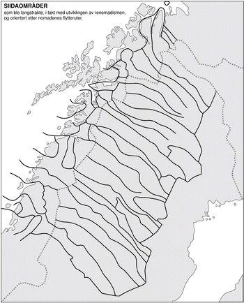 I Finnmark utviklet reinnomadismen seg på grunnlag av tamreinhold i mindre målestokk både blant kyst- og innlandssamene. Etter hvert som driftsmønstrene til disse to gruppene vokste sammen, fikk en de karakteristiske flyttingene mellom vinterbeite i innlandet og sommerbeite ved kysten/på øyene. Lenger sør var ellers det vanlige flyttemønstret for nomadene vinterbeite i skogslandet på svensk side og sommerbeite i høyfjellsregionen eller i kystlandet på norsk side. På Helgeland finner en likevel et flyttemønster med motsatt retning: Vinterområder ute ved kysten og sommerland oppe i høyfjellsregionen, på vestsiden av fjellryggen. Dessuten fantes det i kystlandskapet også mer stasjonære former for reindrift, innskrenket til halvøyene mellom fjordene. Med utgangspunkt i nomadenes flyttemønster endret arealbruken seg vesentlig; de eldre siida-områdene i innlandet ble omformet til langstrakte, øst–vest-orienterte ressursområder, og siida- begrepet fikk nytt innhold: Blant nomadene kom det nå til å betegne en samling av familieenheter som drev reindrift og gjennomførte flyttinger i fellesskap. I norsk kildemateriale fra Nordland og Sør-Troms karakteriseres reindriftsnomadene ofte som «lapper», en betegnelse som ble innlånt fra svensk og finsk side. Lenger nord, og særlig i Finnmark, ble de imidlertid oftest omtalt som «fjellfinner».