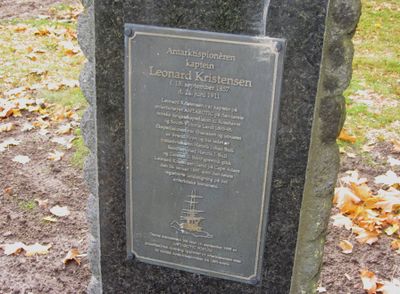 Leonard Kristensen er gravlagt på Vallø gamle kirkegård i Tønsberg kommune. På gravminnet er det satt opp en minneplate med tekst som forteller om Antarctic-ekspedisjonen.