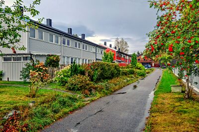 Da den ble anlagt i 2. halvdel av 1960-årene, fikk Lerkeveien fuglenavn i likhet med de andre veiene i nabolaget. Bebyggelsen består utelukkende av rekkehus.