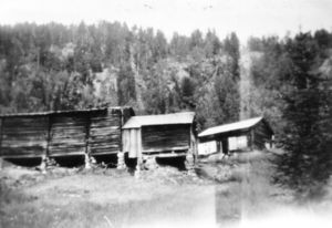 Det lille våningshuset i laftet tømmer, fraflyttet i 1909, men i bruk som seterbu i nesten 50 år etter det. Det må være Nils O. Svartskuren som står foran huset med ljå.