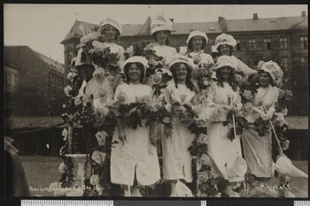 Uke 23 / Veke 23Ukas bildespørsmålHver uke velger vi ut et bilde på Lokalhistoriewiki som vi trenger mer opplysninger om. Som bruker på wikien kan du selv gå inn og tilføye opplysninger på bildesiden – der du også kan finne de opplysningene vi har allerede – eller du kan skrive på bildets diskusjonsside. Her er vi ikke bare ute etter fasitsvar – alle hint er velkomne så vi kan sirkle oss inn mot svaret. Dette fotografiet ble tatt i daværende Kristiania for 110 år siden i disse dager — på Barnehjelpsdagen den 7. juni 1911. Vet du hvor i byen bildet ble tatt, eller vet du hvem noen av personene på bildet var? All informasjon er velkommen! Foto: ukjent |