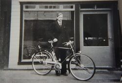 Gunnar Skotte utanfor produksjonslokala til Sykkylven Sportsforretning i 1939. Eigar av biletet er Reidar Skotte.