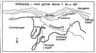 - ↑ Grunnmur etter et hus som var satt opp i forbindelse med det første veianlegget opp Måbødalen