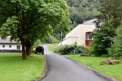 Veien Mæland sett sørover fra Svaddevegen. Rjukanbadet til høyre.