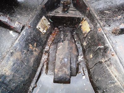 For styrken sin del ser vi her at stilken støttar seg ned på den nye kjølen. Alt etter kva behovet var, vart det lagt flatjern på begge sider med gjenomgåande skruar for auka styrke.
