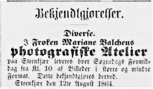 | Mariane Christine Balchen er basert på data fra Preus Museums registre over norske fotografer og fotografiske samlinger, som er tilgjengelig på Nasjonalbibliotekets nettsider. Artikkelen er lagt ut under lisensen cc-by-sa. Lokalhistoriewikis brukere kan fritt redigere og utvide artikkelen. Flere artikler finnes i denne alfabetiske oversikten. |