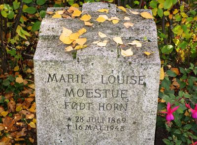 Marie Louise Moestue er gravlagt på Vestre gravlund i Oslo sammen med sønnen Eyvind og hans kone.