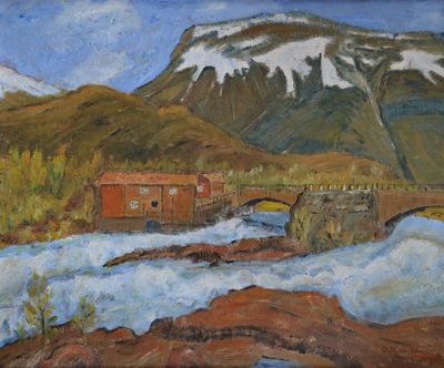 Høgåsen var ein habil amatørmålar. Her eit motiv frå Skjåk, Ofossen mølle. Det er måla i 1944.