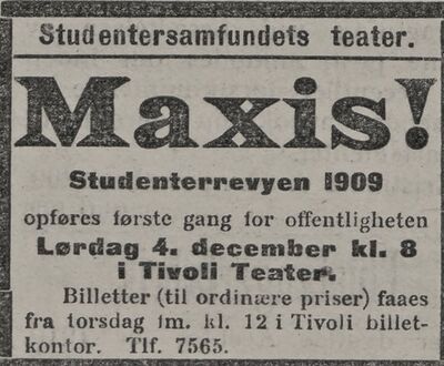 Maxis! var én av revyene til Studentersamfundets Teater i Kristiania. Den ble oppført for 25 fulle hus på Tivoli Teater i Christiania Tivoli fra premieren 4. desember 1909. Forfatterkollegiet på seks mann sto for tekstene. Hovedmannen var Adam Hiorth, administrerende direktør for teateret.