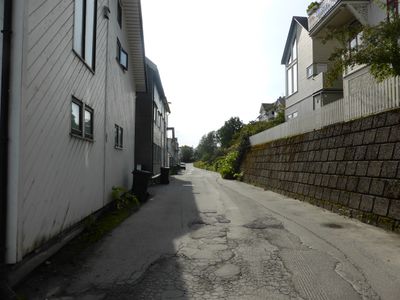 Samme motiv, fra mellomkrigstida. Fram til 1915 lå husene på oversiden av vegen i Tromsøysund kommune, de på nedsiden, nr. 2-14, lå i Tromsø. Bygrensa svingte ned gjennom plankegjerdet bortenfor de nærmeste uthusene. I bakgrunnen svinger vegen ned i Strandskillet.