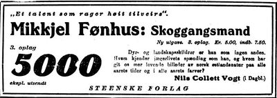 Faksimile; annonse for Fønhus' bok Skoggangsmand i Aftenposten 22. desember 1921.