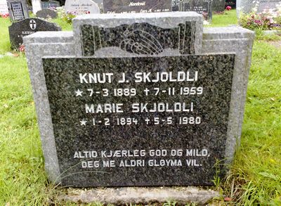 Gravminnet til Marie (f. Reime) og Knut Skjoldli på Voss kyrkjegard. Knut Skjoldli var baneformann på Mjølfjell, så han og familien budde i vokterboligen ved stasjonen. Foto frå 2011.