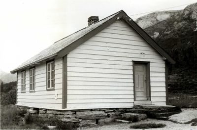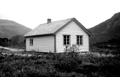 Mjell, Gaular, Sogn og Fjordane. Lite kvitt skulehus ved veg. Bygd i 1893. Registrering utført 1958-59 av Johan Schiong for Noregs Lærarlag.