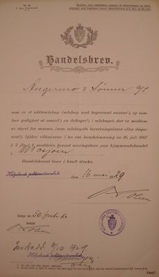 - ↑ Person 1: Lars Dalbak Vik, handelsmand, Viks sogn Bronø Nor; Person 2: Thomas Ask, Handelsmand, Ørlandet ST; Person 3: Oluf Ulstad, Handelsborger, Beistaden NT; Person 4: Hans Rønneberg, Handelsborger, Aalesund Rom; Person 5: Berendsen, Handelsborger, Kjøbenhavn; Person 6: Daniel J. Pedersen Skog, Handelsmand, [Vefsn]; Person 7: Edvard Marthin Eliassen, Handelsm., Donnæs Nor; Person 8: Ole S. Elnan, Handelsmand og Dampskibsexpeditør, Beitstaden NT.