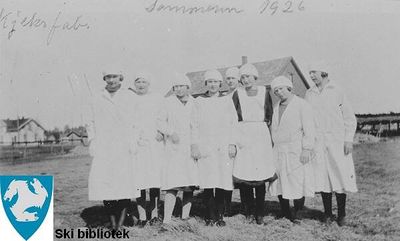 Kjeksfabrikken lå ved søndre del av Jernbaneveien i Ski sentrum. På bildet skimter vi fabrikkbygningen bak arbeiderne.