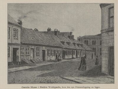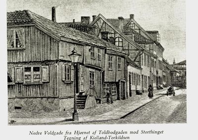 Parti fra Nedre Vollgate på en akvarell fra 1891.