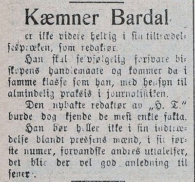 En av de store sakene i 1911-1912 var striden om hvor byens hovedkai skulle ligge. Bardal var havnestyrets formann og dermed midt i stridens sentrum, og han kjempet saken frem gjennom Harstad Tidenes spalter. I desember 1912 kjøpte han Harstad Tidende og ble selv redaktør. I tillegg ser vi av avisannonser fra 1915 at han drev som agent for et brannforsikringsselskap.
