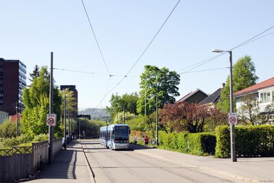 Parti fra Niels Henrik Abels vei med trikk av type SL18.