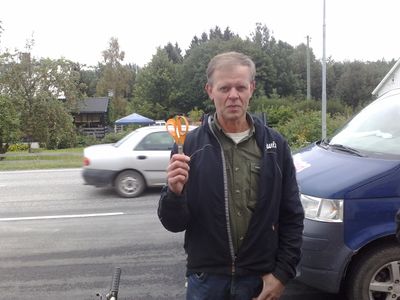 Johannes Bakken, gardbrukeren på Nord-Steinsli. Her viser han fram saksa som skulle brukes under åpningen av gang- og sykkelvegen Bondelia-Nordlia Handel.