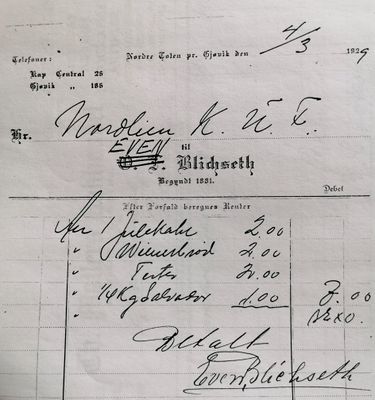 Nordliens K.U.F. kjøpte julekake, wienerbrød, terter og Salvador kaffe av Even Blichseth på Nordlia Handel. Kvittering datert 4. mars 1929.