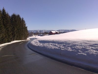 Bakkene mellom Sandåker og Stor-Nøkleberg, vi skimter husa på Nøkleberg. Totenåsen i bakgrunnen.