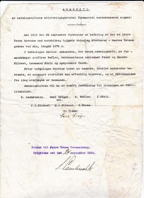 - Amtsingeniørens avleveringsprotokoll, 20/9 1915, avskrift i Østre Toten kommunearkiv.