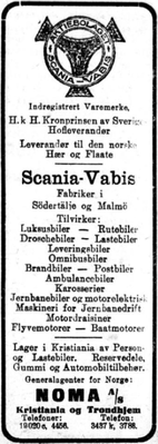 NOMA var en av Norges første bilforhandlere. Selskapet var generalagent for svenske Scania-Vabis,[4] og importerte også Dodge fra USA. Datidens bilfirmaer i storbyene var gjerne både bilimportør og bilforhandler. På lokalnivå omfattet NOMAs virksomhet i tillegg salg av bilmotor og -rekvisita samt bilreparasjon.