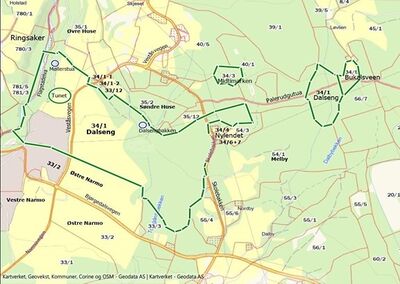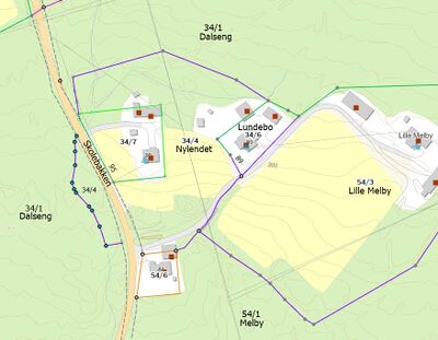 Kartet viser situasjonen før 34/6 og 34/7 ble fradelt. Vi ser beliggenheten av boligen og uthuset til Kristian Lunde på 34/4 Nylendet, og som i 2008 ble fradelt Nylendet og registrert som egen eiendom 34/7 Skolebakken 95.