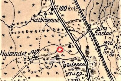 | Plassen Mellem på kart fra 1805 rett vest for plassene på Sør-Rasta. Senere skiftet plassen navn flere ganger til den fikk navnet Nylenna før den ble borte. Karverkets historiske arkiv. | |