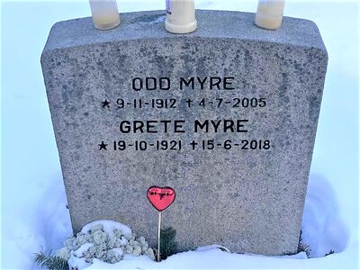 - ↑ 1,0 1,1 Minneside basert på bilder og gravminnedata for Odd Myre. Slekt og Data Gravminnebasen. Besøkt 14. juli 2022.