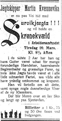 Martin Kvænnavika var en jektebåtskipper, som sammen med mannskapet på båten Survikjekta, opplevde en rekke groteskt komiske episoder. Mye av humoren var basert på karakterenes navn og karikerte personligheter, slik som Simen Elifantus Labanussen Gjeithustrøa, Senæppa Valrianna Tanglusbokta, Frøskatt-Anners Tanglusbokta og Gurru Rasemine Mirakla Pedersdatter Gjeithustrøa.