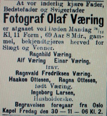 - Olaf Væring i folketelling 1900 for Kristiania kjøpstad fra Digitalarkivet.