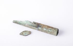 Sølvbeslag fra eldre jernalder funnet i en gravhaug på gården Mellom-Kvem, Østre Toten i 1871.
