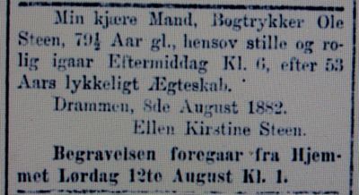Ved folketellingen for Bragernes prestegjeld i Drammen for 1865 er Steen oppført som boktrykker med adresse Fremgade 225c (Fremgade var navnet på dagens Øvre Storgate vest for Gamle Kirkeplass). Ved folketellingen samme sted for 1875 er han oppført som boktrykker med adresse Nedre Bragernes.