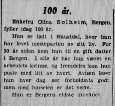 - Bergens Tidende, 19. oktober 1935: «Byens eldste. Olina Solheim fyller 100 år».