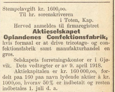 Mauritz Schonhowd startet bedriften. Han var født på Toten og hadde vært disponent i Totens Ullvarefabrikk på Skreia fra 1905 til 1917. I 1917 begynte han å bygge opp klesfabrikken ved Gamletorvet i Gjøvik sentrum. I mai 1918 ble Aktieselskapet Oplandenes Confektionsfabrik anmeldt til firmaregisteret i Toten sorenskriveri.
