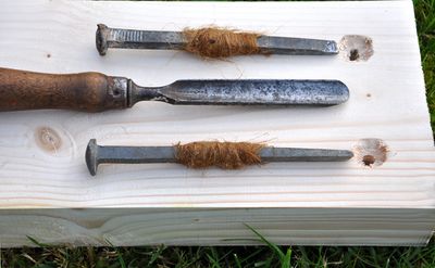 Navaren gir eit kona hol. Ytre vert skylpa ut rundt holet, så det vert som ei lita gryte for boltehaudet. Når bolten vert innslegen dreg litt stry seg med inn i bolteholet, og resten legg seg under haudet. Dette tettar for lekasje langs med bolten. Alle boltar vert til sist innpora om lag 1 cm inn i planken, og det vert pussa over med sement.