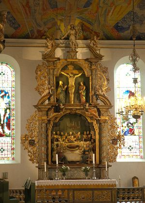 Altertavlen er tredelt; nederst er en fremstilling av nattverden, i midten Kristus på korset med Maria og Johannes og øverst den seirende Kristus. Kirsten Toller, en rik enke bosatt i byen ga 500 riksdaler til utføringen av altertavlen og den ble utstyrt med hennes families våpenskjold.[28]