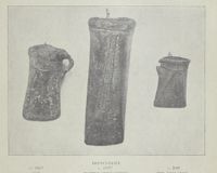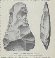 Øksene fra Sannergata. Båtøks til venstre, tynnakka flinøks til høyre. Fra Akers historie, utgitt 1918.