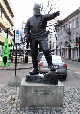 Bauta over Otto Sverdrup i "Gammelheimsparken" Steinkjer, utført av Carl Edvard Paulsen, avdukes av Kronprins Olav 21. juli 1957 i forbindelse med Steinkjers 100-årsjubileum.