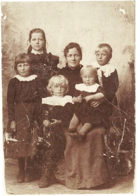 I 1885: Sjøfarende Albert Meyer Hansen med kona Marie og datteren Fanny, maler Michael Aas med kona Petra Dorthea, fire barn og lærerinnen Amalie Aas.